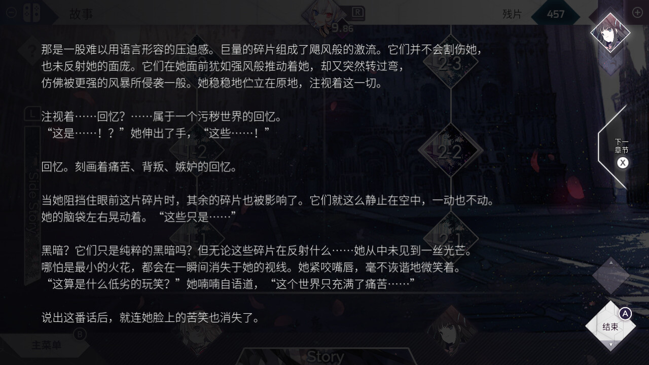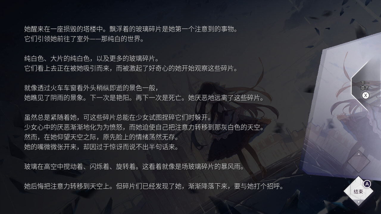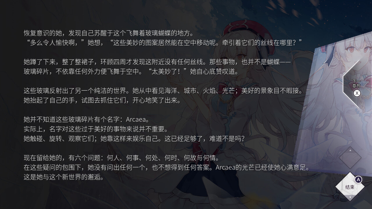 而接下来,她们会发现一个名叫Arcaea的物体。它由空中漂浮着玻璃质感般的碎片所积聚而成,而这每一块碎片,都包含着来自过去的鲜活回忆…